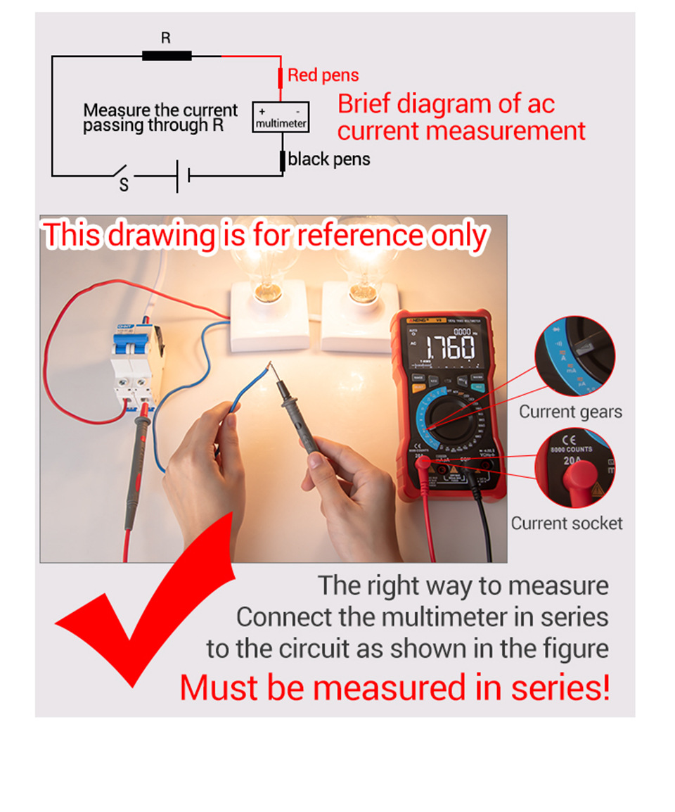 • Current Measurement: Always connect the multimeter in series with the circuit when measuring current. Direct contact like voltage measurement can damage the instrument.