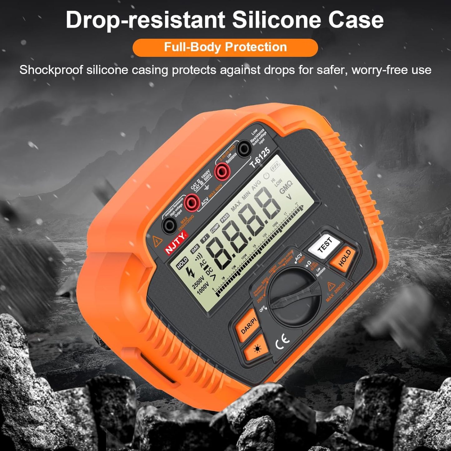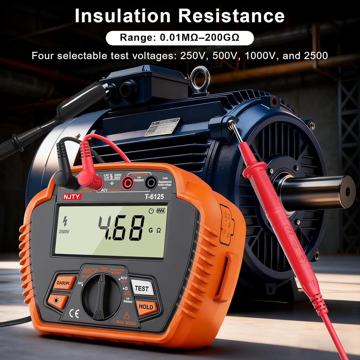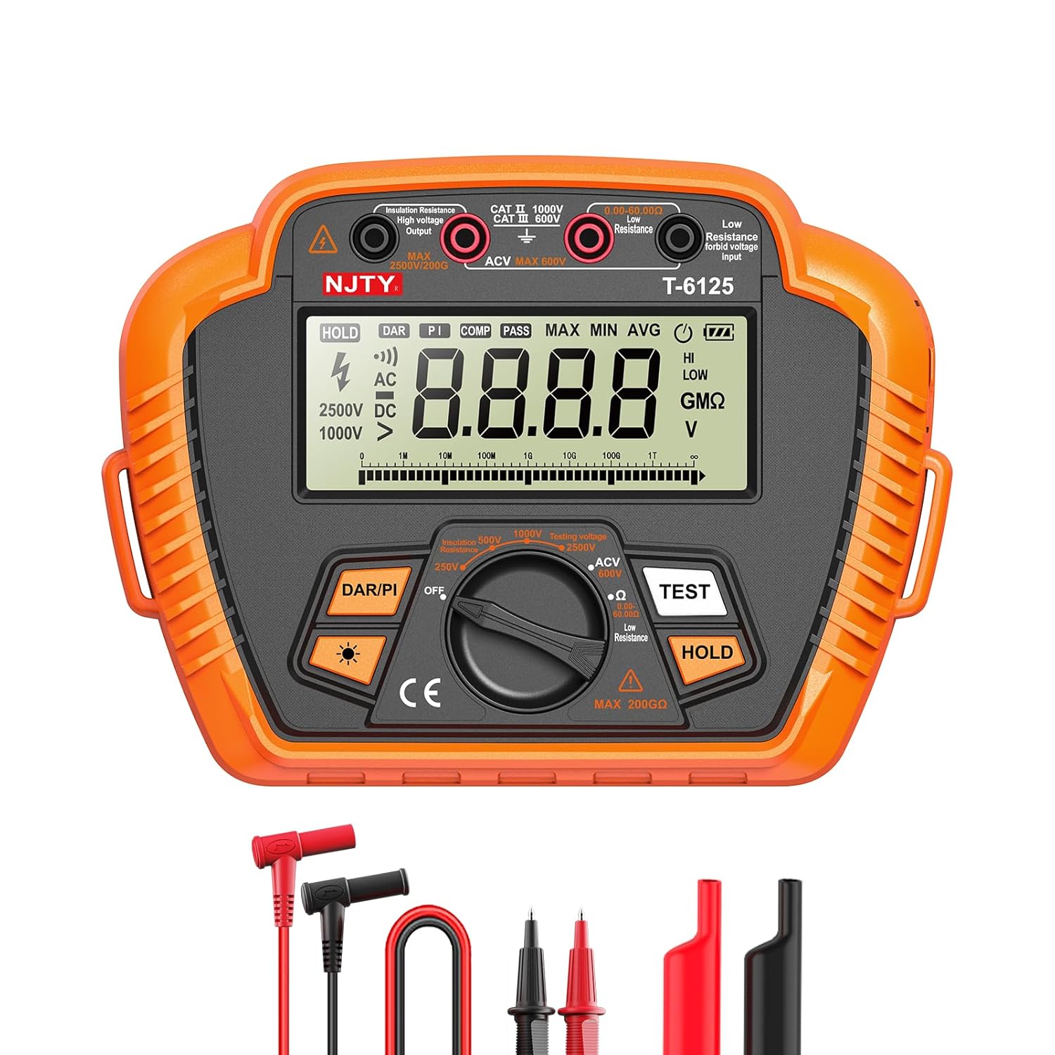 The NJTY T-6110 is a professional-grade digital insulation resistance tester designed for high-precision measurement in electrical maintenance, industrial equipment inspection, and power system diagnostics. Featuring a rugged orange anti-drop plastic housing, a large 3.54-inch backlit LCD display, and intelligent testing functions, this device delivers reliable performance for measuring insulation resistance up to 20GΩ under test voltages of 100V, 250V, 500V, 1000V, and 2500V.