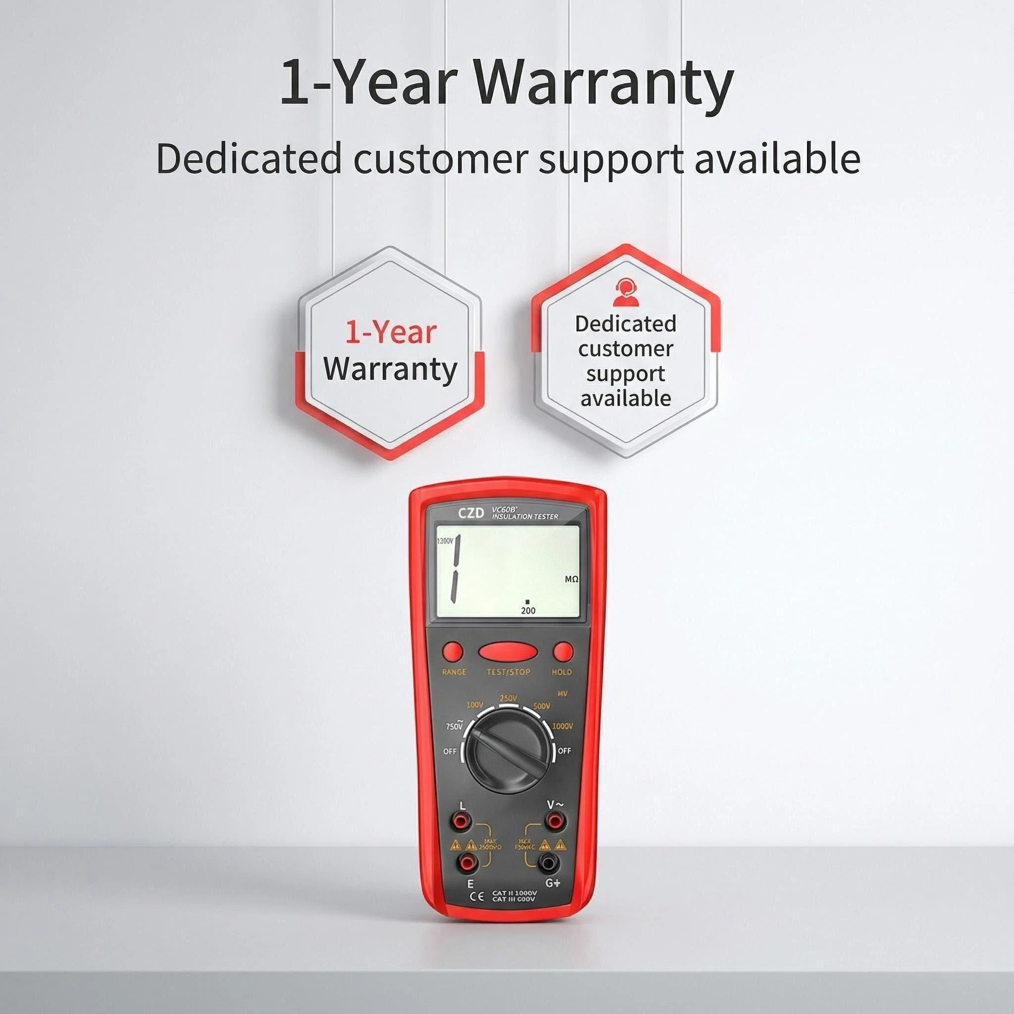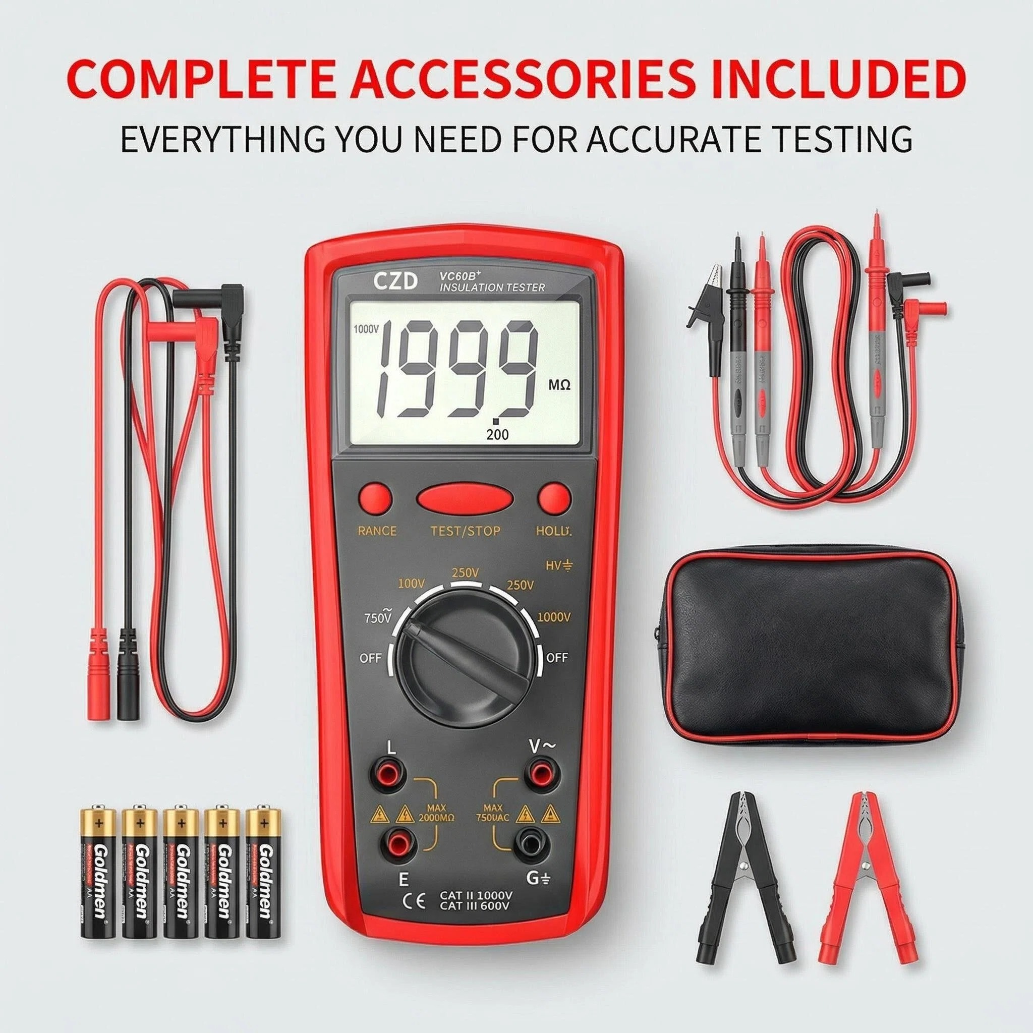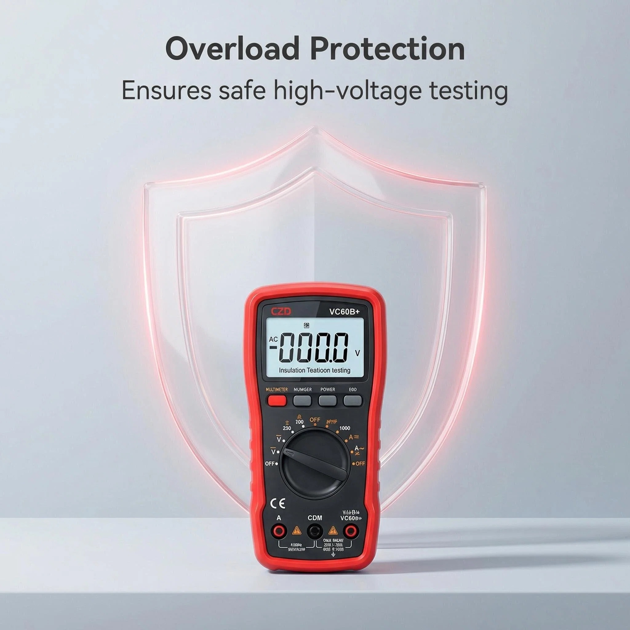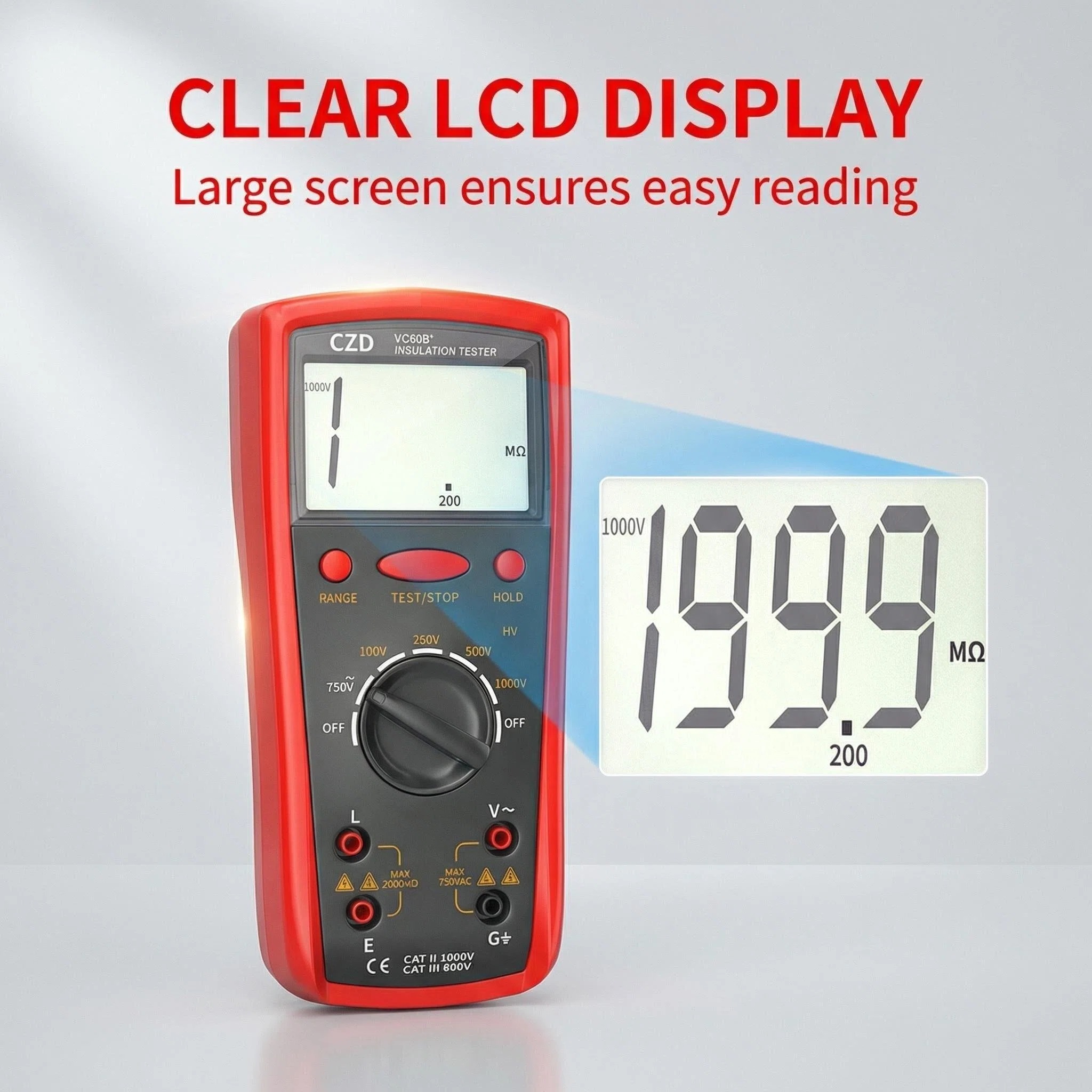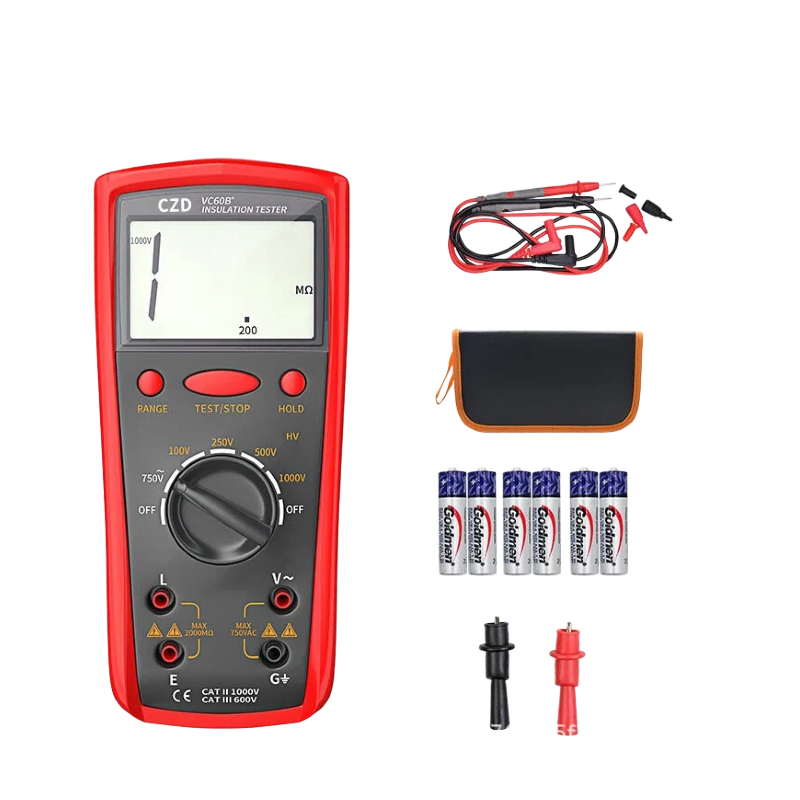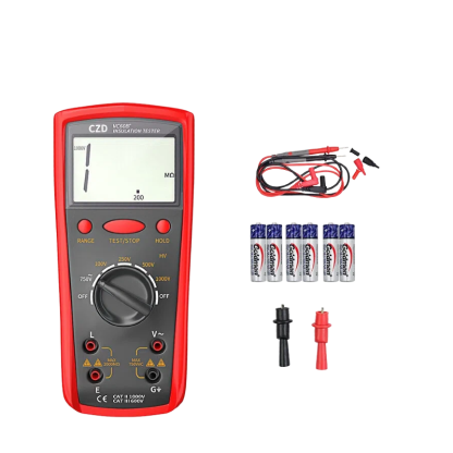 The CZD VC60B+ is a professional-grade digital insulation resistance tester designed for electrical maintenance, industrial equipment testing, and cable integrity verification. With a robust red protective casing and a clear LCD display, this device offers high-precision measurements up to 1000V, making it an essential tool for electricians and engineers working with motors, transformers, and power distribution systems.