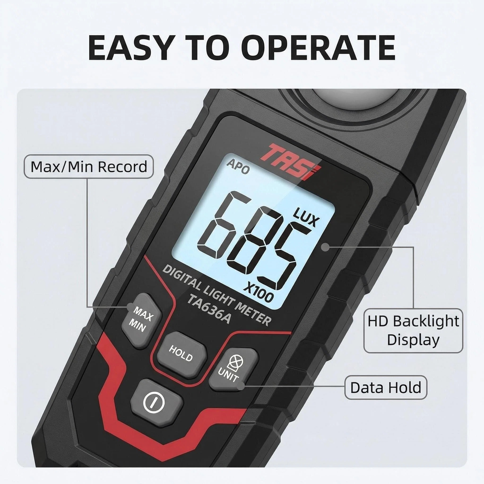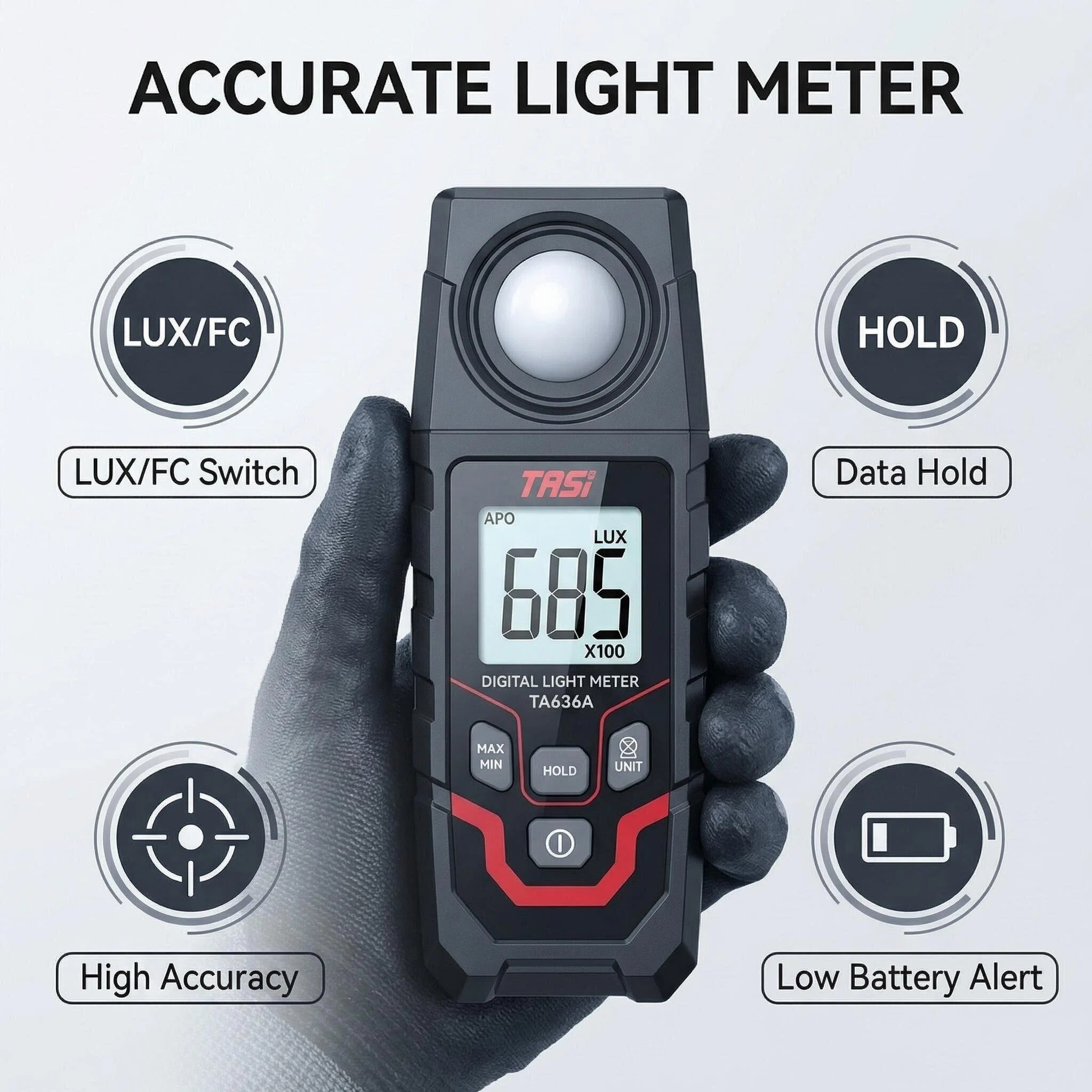 VINDAION TASI Digital Lux Meter is a professional, high-precision illuminance testing tool engineered to deliver accurate, stable light intensity readings in diverse scenarios. Designed for both professional users (lighting engineers, photographers, industrial technicians) and daily users, this portable photometer combines reliability, ease of use, and versatility, making it an essential tool for all your illumination detection needs. Whether you need to test indoor lighting, calibrate LED fixtures, monitor plant grow lights, or check workplace/classroom brightness, the VINDAION TASI Lux Meter ensures consistent and precise results every time.